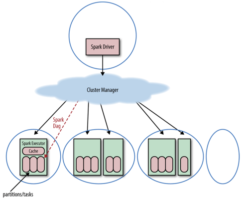 SparkContext启动,driver program pings cluster manager,cluster manager在worker nodes中申请下发Spark executors (JVMs shown as black boxes in the diagram)
